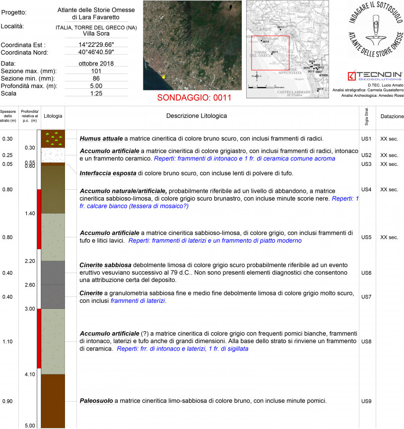 Il sondaggio 0011 è stato spinto fino a 5 m dal piano campagna e posizionato a est del complesso della villa visibile e coperto da una tettoia metallica in una zona a ridosso del portico scavato in età borbonica e rappresentato in pianta da Tommaso Sarto.